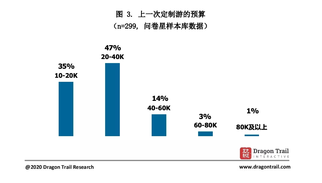 問(wèn)卷顯示,定制游游客每一次的定制旅行消費(fèi),在人民幣2萬(wàn)到4萬(wàn)之間,35%的游客消費(fèi)1萬(wàn)至2萬(wàn),18%的游客消費(fèi)4萬(wàn)以上。相比于高端市場(chǎng),大眾市場(chǎng)對(duì)于服務(wù)的價(jià)值不夠了解,因而在首次接觸定制游時(shí),無(wú)法將定制游的服務(wù)價(jià)值量化在預(yù)算中。
