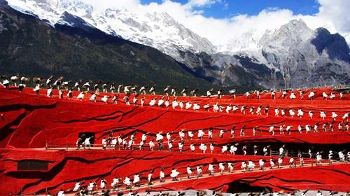 一部分紅土地翻根待種,另一部分紅土地已經(jīng)種上綠綠的青稞或小麥,而這時(shí),云南特有的白色油菜花也已盛開,豐富的色彩加上高原變幻萬千的光影,猶如一幅水彩畫。