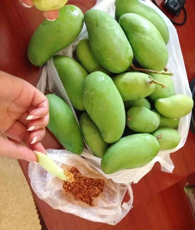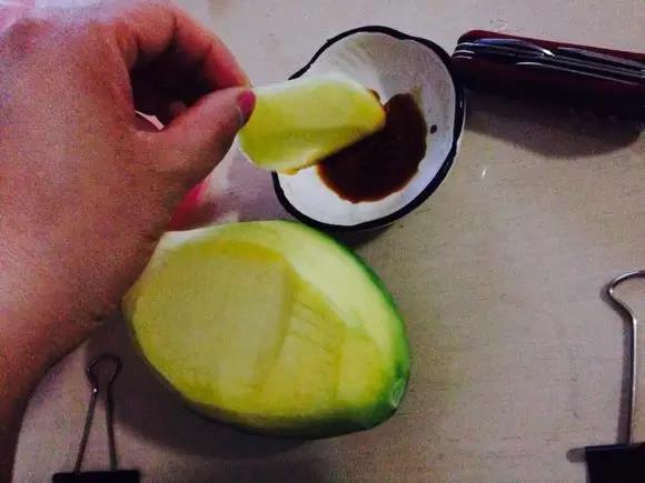 青芒果還有另一種吃法呢!將芒果削成薄片,浸在醬油里,拌上切細(xì)的新鮮小米辣、蕪荽,多了點(diǎn)甜味,少了些酸味脆味,也少了口感的刺激味,但是別有一番風(fēng)味。