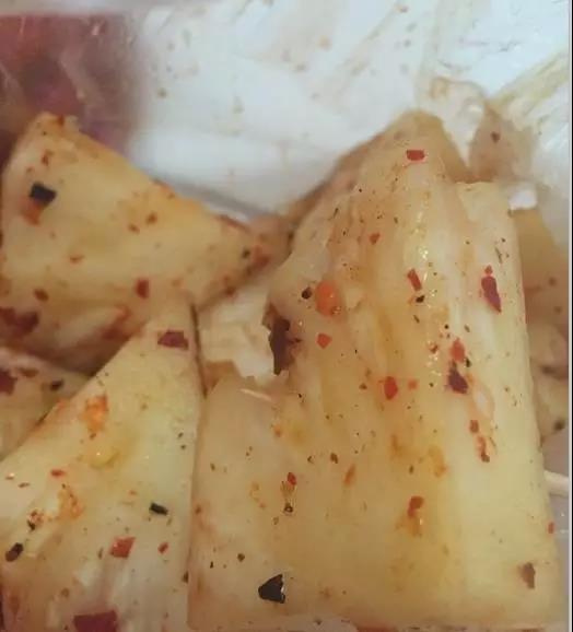 涼開水溶解適量的鹽,不要太咸。把菠蘿切片,放入水中浸泡5到10分鐘即可。放入辣椒、香菜,即可成為云南可口的涼菜或零食。