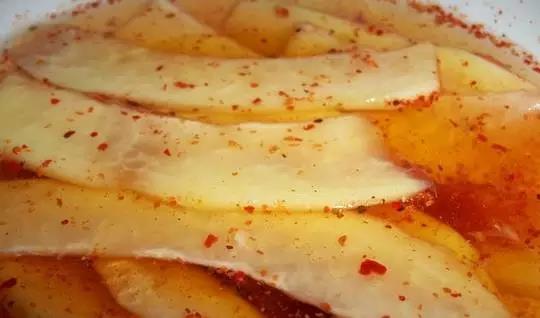 泡梨算是云南的特產(chǎn)吧,是一種獨(dú)特的泡菜。原料是麻梨,或者小葫蘆梨,做法是將梨盛于大大的陶制壇內(nèi),按比例加入甘草、酒、鹽、花椒、清水等,密封浸泡一個(gè)月左右,開封食用。吃起來酸酸甜甜,脆脆的,還有一股甘草的清香,很特別。第一次吃的時(shí)候可能會(huì)不習(xí)慣,但多試幾次,保證讓你欲罷不能!