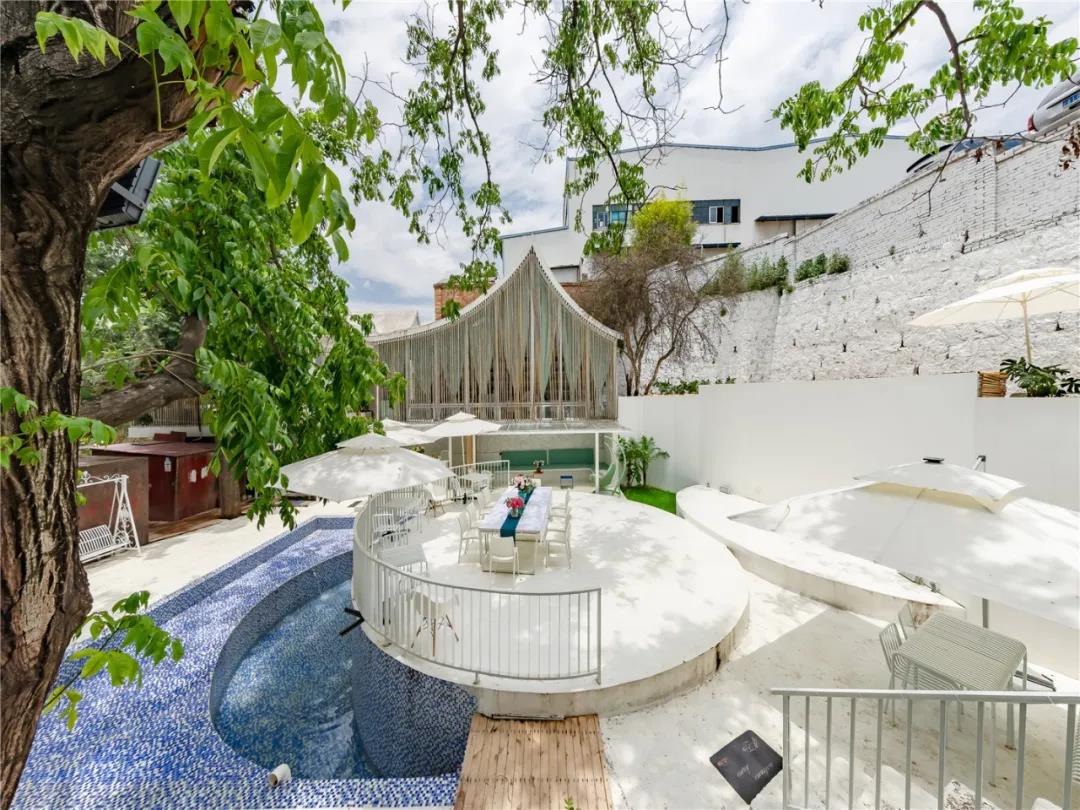 民宿是一棟純白的小樓,遠(yuǎn)看上去就像一個(gè)純白色的城堡,干凈的白色設(shè)計(jì)清新夢(mèng)幻,布置也超級(jí)浪漫,搭配月牙形狀的露天泳池非常美麗。