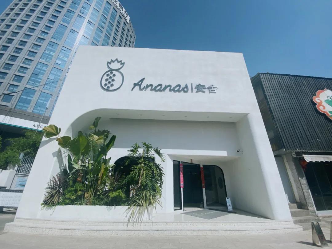 ANANAS安舍酒店在穿金路上,臨街白色建筑很顯眼,綠植很多。酒店的Logo“一個(gè)碩大的菠蘿”形象,和酒店所處位置“菠蘿村”密不可分。