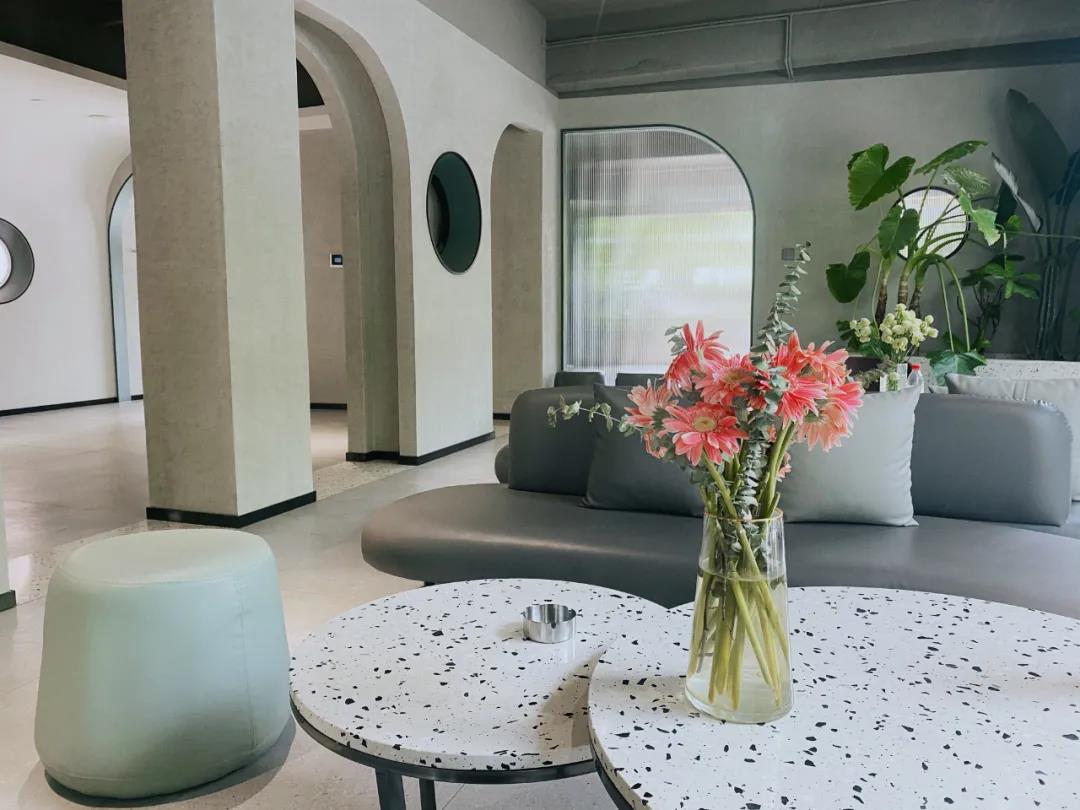 一樓整個(gè)公共開(kāi)放區(qū)域每個(gè)角落都可以出片,桌上點(diǎn)綴的鮮花與周圍綠植相映成趣。