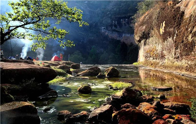 大自然的天工之作,造就了水城河數(shù)道不同類型的瀑布,河床兩岸巨大奇特的紅砂巖與原生植被交融一體,形成靚麗景觀。