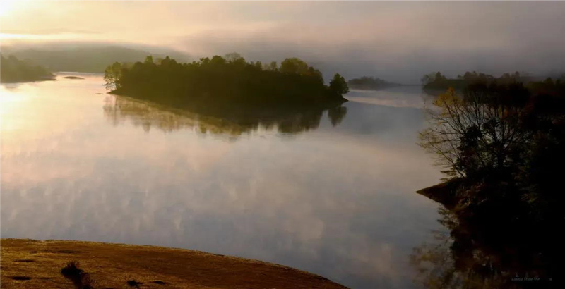 凱邦亞湖最迷人的是它的清晨,日出之際,云霧將散未散,波平如鏡的湖水倒影著云霧,仿佛橙黃色的火焰在湖中舞動(dòng)。