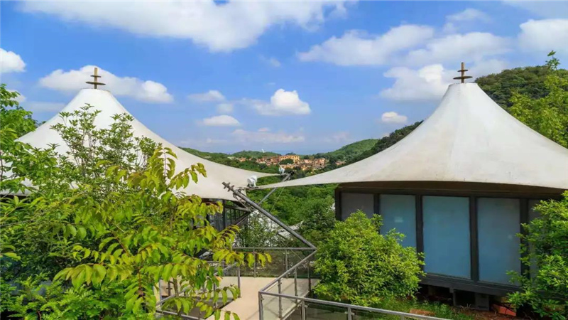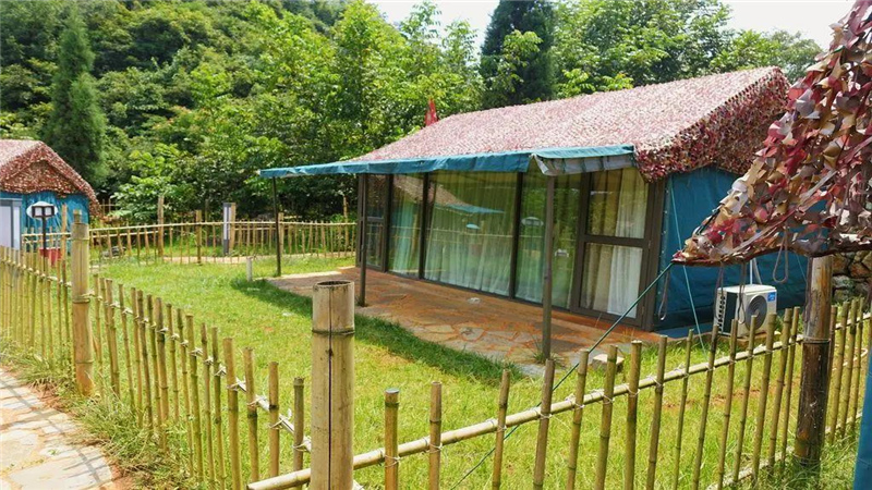 每個軍旅帳篷頂用五公分厚的橡塑保溫隔熱材料鋪設(shè),墻體由中空玻璃鑄成。且每個帳篷外均帶獨立小院,竹欄圍繞,花草簇擁,別有一番情調(diào)。