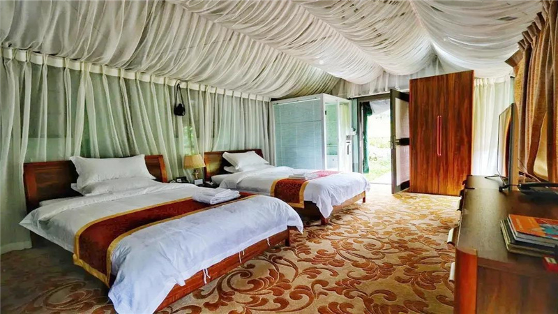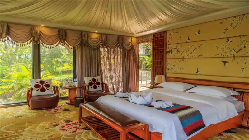 酒店共有三種特色帳篷:澳洲、彝家、軍旅帳篷。帳篷酒店依山而建、遠山纏綿,就像美人的脊背。美到讓人忘記所有的煩惱,進入徹底的避世頻道。