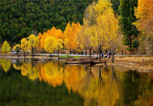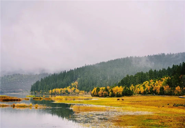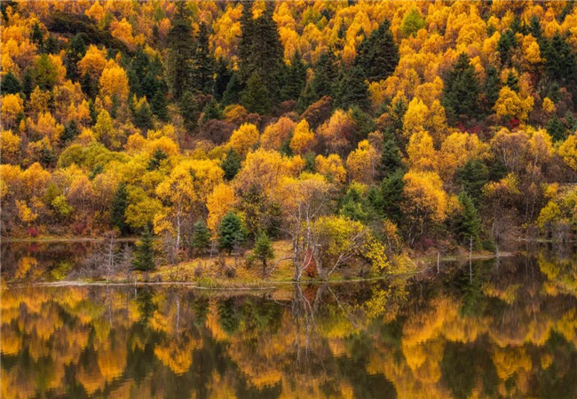因為這個時節(jié)的普達(dá)措,草色金黃、層林盡染、五彩繽紛。