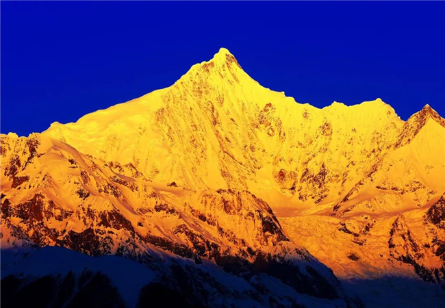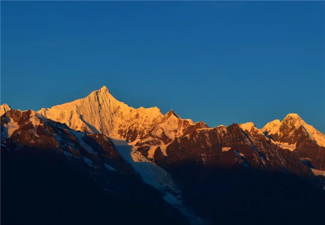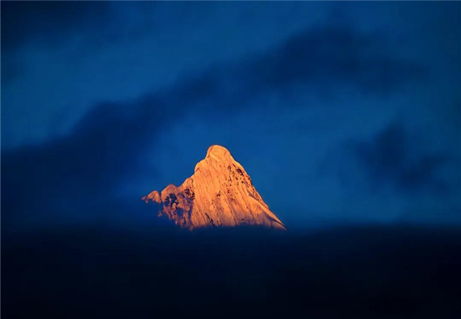 7點多鐘,海拔最高的山峰由暗變亮,隨后太陽光向上爬升,瞬間照射在雪山頂上,出現(xiàn)金色的光暈。