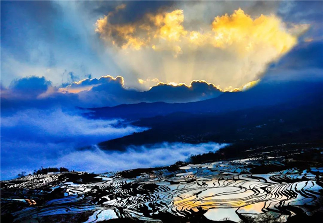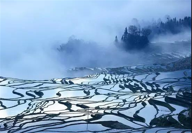 每年栽秧季節(jié),別有情趣,上部的水田放水,一丘流入一丘,好像成千上萬(wàn)個(gè)小瀑布,纖巧娟秀,別有一番景色。哀牢梯田,季季如畫,景象萬(wàn)千。