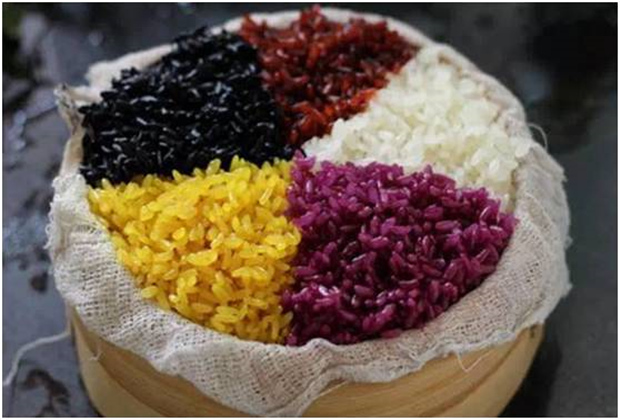 五 色 糯 米 飯,五色是紅、黃、綠、白、黑五色。紅、綠、黑色均取用三種樹葉汁的天然色素,黃色取用黃飯花的花冠熬出來的天然色素,幾種植物色素清香無比,白色用糯米飯潔白的本色。天然色素有益無害,各有清香。