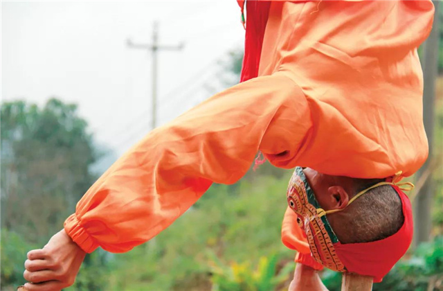 最精彩的部分屬掛軟套和鉆圈:“軟套”是幾根繩索結(jié)成的套圈,掛軟套要雙手離開附著物,從橫梁上滑落,雙腳精準(zhǔn)落入軟套,懸空倒立而吊;“鉆圈”則是倒立垂直從高空落下。