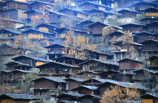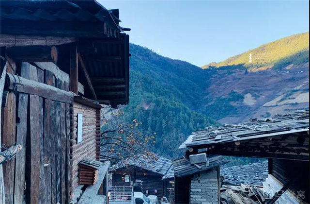 在村里,房屋基本都是木質(zhì)結(jié)構(gòu)的,木質(zhì)的屋頂上壓著用以固定的石頭,井干式的木楞房依山而建,錯(cuò)落有致。