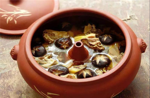 湯鍋的水開后,蒸汽就通過汽鍋中間的汽嘴將雞逐漸蒸熟(一般需3 ~4小時)。由于湯汁是蒸汽凝成,雞肉的鮮味在蒸的過程中喪失較少,所以基本上保持了雞的原汁原味。