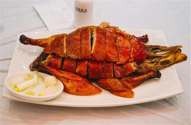 烤鴨肥瘦相宜,皮酥脆,內(nèi)香嫩,光亮油潤,色澤紅艷,清香離骨,地方風味顯著。