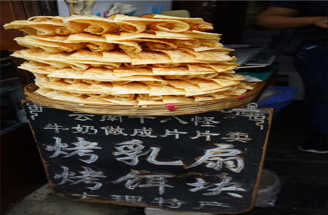 乳扇攜帶方便,造型特殊,食用也方便,烤、炸、涼吃均可,甜、咸都適宜。乳香沁脾,酥脆泡松,是下酒好菜,在大理街邊小攤都有賣。