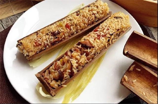 先把香竹按兩個竹節(jié)砍下,在一端的竹節(jié)中挖一個孔,把洗過的糯米放入香竹中,再加入一些水,然后用竹葉塞住孔,放在火炭上烤。到竹子的水分被烘干后,竹筒就會自然爆裂,里面的香竹飯也就熟了。
