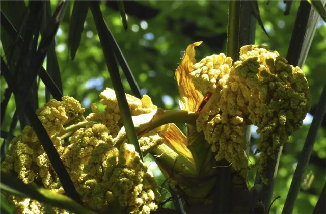 棕包花即棕櫚樹的花苞,狀如魚卵,花色金黃,手掌大小,敦厚如實(shí),長(zhǎng)得就不像食物的樣子,在許多地方都能見到,卻很少有人注意它,是很多云南小孩的記憶中嬉戲打鬧的最佳工具。