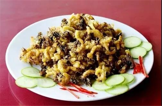 油炸蜂蛹蛋白質(zhì)較高、營養(yǎng)極為豐富,而且噴香可口,是難得遇到的云南佳肴。一口下去嘎嘣脆,不僅營養(yǎng)豐富,口感也十分爽。每年都有外省游客來云南感受油炸蠶蛹、油炸螞蚱等美食。