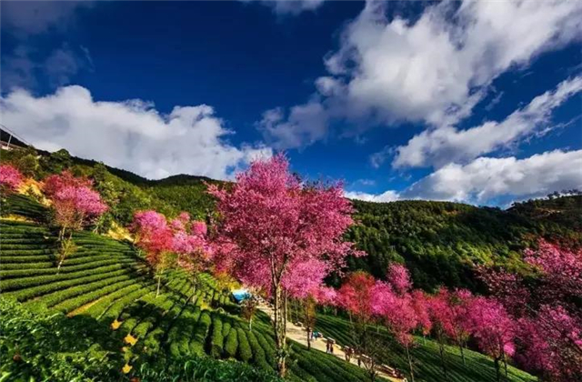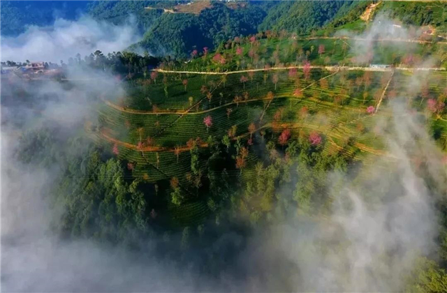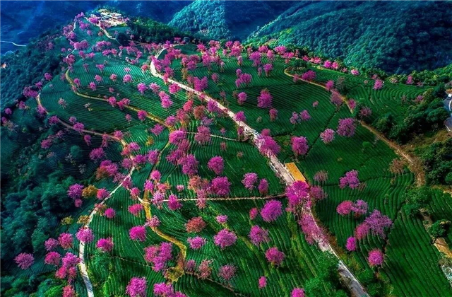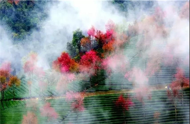 粉紅色的花,白色的云霧,綠色的茶園……漫步在云霧繚繞的茶園,碧波翻滾的新綠映襯著如霞似火的粉色櫻花,仿佛置身于油畫(huà)之中!遠(yuǎn)遠(yuǎn)望去,一株株櫻花與層層茶田相得益彰,譜寫(xiě)著綠茶紅櫻相戀相守的浪漫樂(lè)章。