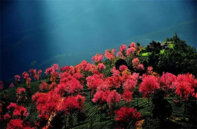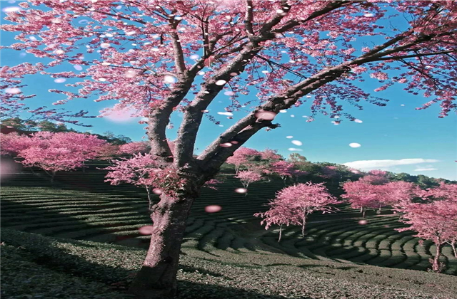 欣賞櫻花最好的時(shí)間是在清晨,牽手漫步于云海之上的千畝茶園,碧波蕩漾的翠綠,映襯著如霞似火的粉色櫻花,讓人仿佛置身于油畫(huà)中。
