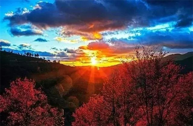 然后太陽(yáng)毫不吝嗇的傾灑向整個(gè)山谷,櫻花亮了起來(lái),群山亮了起來(lái)......天上朝霞似火燒,地上櫻花紅艷艷,眼前看到的簡(jiǎn)直就是一幅畫(huà)!