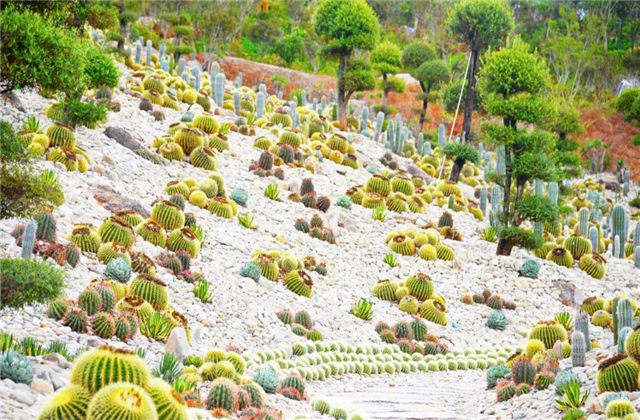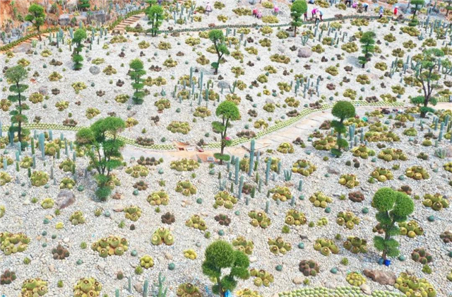小鎮(zhèn)里還有個山地石漠化公園,偏坡山地上鋪滿鵝卵石,鵝卵石縫隙間種上仙人掌、龍舌蘭等沙生植物和景觀樹,形成了令人驚嘆的奇特景觀。