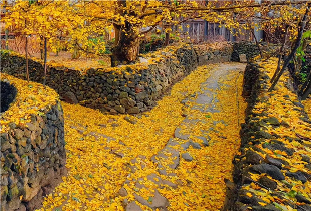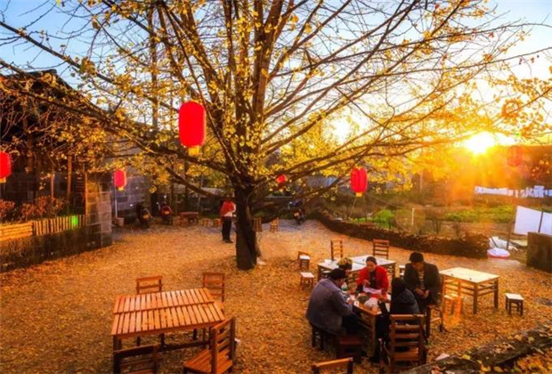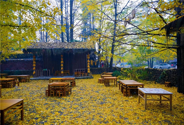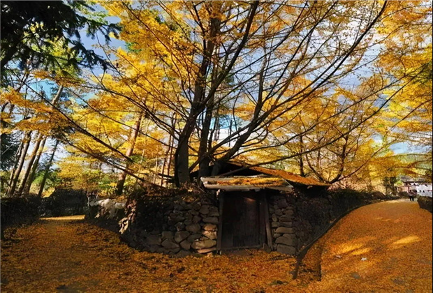 房前屋后,黃葉紛飛,滿地金黃,隱于群山懷抱,現(xiàn)于農(nóng)莊炊煙之間,異常美麗,可謂是一場視覺的盛宴!