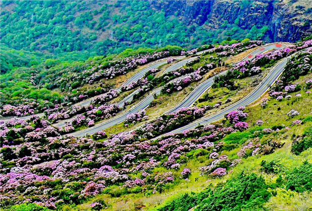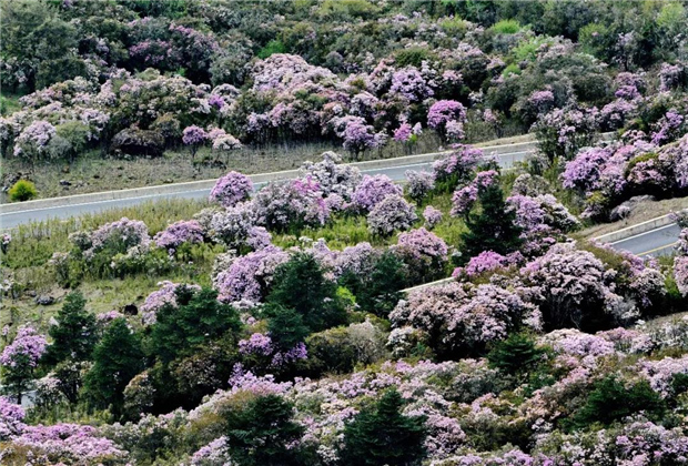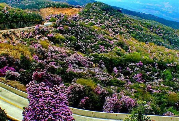 但是杜鵑花開的時節(jié),彎彎曲曲的五臺坡公路邊上開滿了大樹杜鵑,粉紫色的花海牢牢吸引著你的視線,暈車?不存在的!