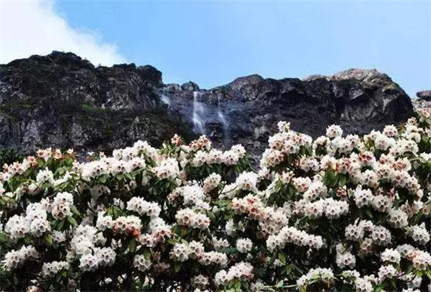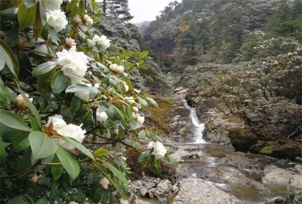 此時的轎子雪山被杜鵑花掩蓋,不管是山頂、樹下、崖壁和溪水邊都成了一片花的世界。