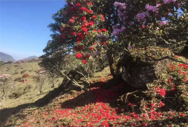 四方景是今年杜鵑花最早盛開的地方。大片的粉色、紫色、紅色杜鵑花占領了整個山頭。