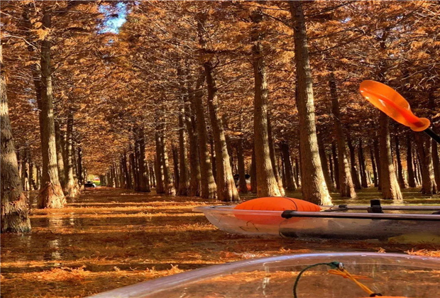 泛舟森林,充滿(mǎn)了詩(shī)情畫(huà)意。夏季水波蕩漾,寂靜清幽,到了秋冬就換上紅妝變了副模樣。