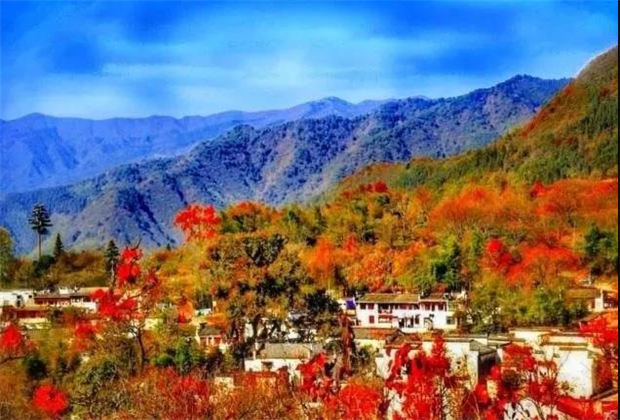 漫山遍野的烏桕樹把房屋籠罩,與田間白墻黑瓦的小村,形成了一幅絕美的油畫。