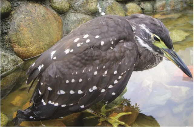 海南虎斑鳽背部長著褐灰色羽毛,胸脯和頸部有白色花點,長長的腳干,尖尖的嘴,眼睛特別大,看上去甚至有些滑稽。上體的羽毛為暗褐色,飛羽呈石板灰色,并具有綠色的金屬光澤,翅膀上的覆羽為暗褐色,具有少許白色的斑點。主要棲息于亞熱帶高山密林中的山溝河谷和其他有水域的地方。海南虎斑鳽是世界上公認的鳥類瀕危物種,因第一個模式標本于1899 年采自海南島的五指山而得名。自從二十世紀六十年代后,人們再也沒有發(fā)現(xiàn)這種鳥的蹤跡,因此有“海南虎斑鳽已滅絕”之說。2006年在云南南澗縣首次發(fā)現(xiàn)其身影;2007年在云南新平縣又發(fā)現(xiàn)其倩影并上了環(huán)志;2008年10月份,在云南省哀牢山國家級自然保護區(qū)海拔 2300—2400米的山坡上,工作人員也為海南虎斑鳽上了環(huán)志。