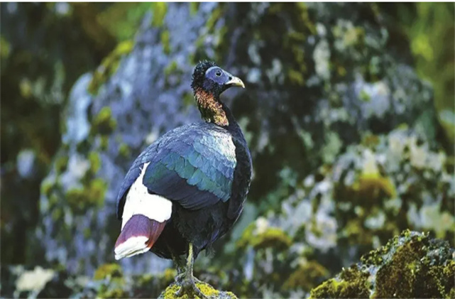 白尾梢虹雉又被稱作“雪鵝”,體長達58—67厘米,雄性色彩絢麗,上體大都呈金屬藍綠色,下背依次純白,尾棕色而端部白色,下體純黑。嘴長而稍彎,上嘴較下嘴稍大而覆蓋下嘴。白尾梢虹雉多棲息在海拔2500—3400米的箭竹林、針葉林和草甸等生物環(huán)境中,完全適應溫度低、濕度大、云霧多的高山環(huán)境。在中國,白尾梢虹雉僅分布在云南西北部的騰沖、瀘水、西藏東南部丹巴江上游山脈、福貢和貢山一帶,是典型的留鳥。該物種是滇西北部高黎貢山自然保護區(qū)的主要保護對象之一。
