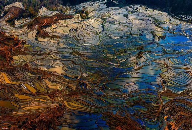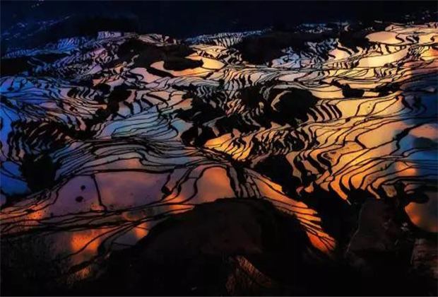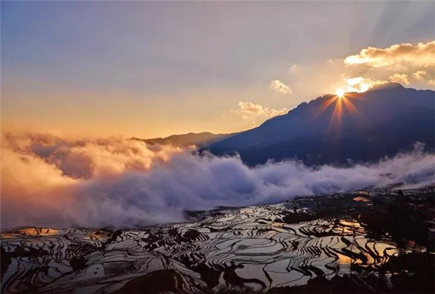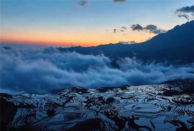 灌滿水的元陽(yáng)梯田倒映著云海天光