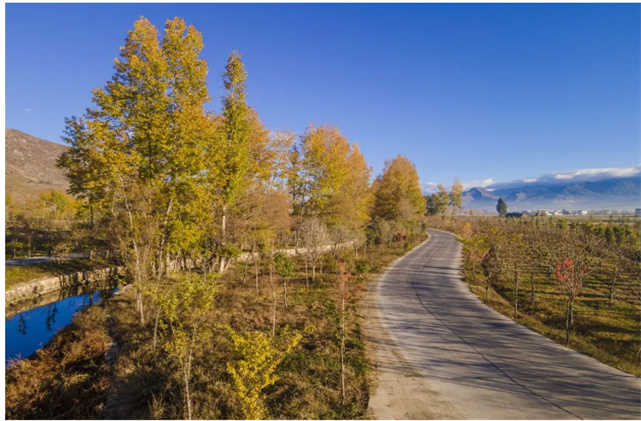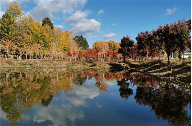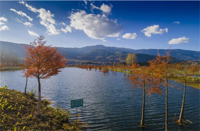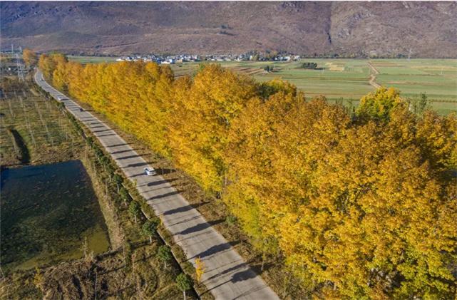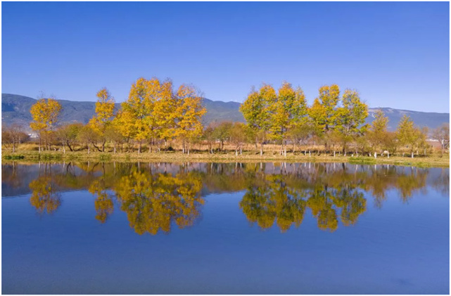冬日,陽(yáng)光照在洱源縣的彌茨河兩岸,透過(guò)斑駁的樹(shù)影,河水亮晶晶的,雖然是冬天,卻感覺(jué)不到蕭瑟凄涼。一排排樹(shù)木俏立兩岸,樹(shù)上一大片一大片的金黃撞入眼底,美得絢麗;落光了葉子的白楊直插云霄,薄云在晴空里悠悠蕩蕩,一會(huì)兒像輕紗拂過(guò),一會(huì)兒又如獅吼而過(guò),美得神秘;隔離帶里一棵棵艷麗的紅楓讓人眼前一亮,藍(lán)天,白云,紅、黃、綠各色的樹(shù)木倒影在水里,就像一幅渾然天成的油畫(huà),美到窒息。駕車在河畔的公路穿行,欣賞了一路的美景,走進(jìn)樹(shù)林,踩在厚厚的落葉上,隨著“嚓嚓”的聲響,就如行走在深沉的往事里,忍不住想在這駐足,回望往事,輕輕地?fù)崦约旱膬?nèi)心,自然之美讓人自愈、使人迷醉。