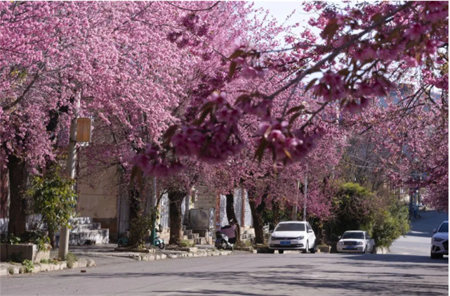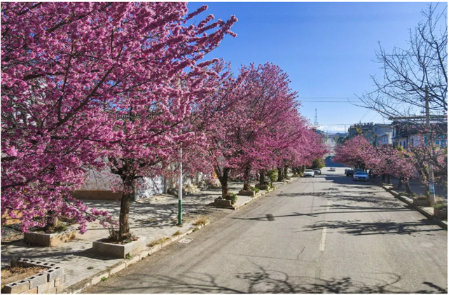 在冬日綻放的櫻花,總能吸引一些人特意尋它而來(lái),在鏡頭里記錄下它的美,就連鳥(niǎo)兒和蜜蜂都被吸引來(lái)了,圍著花朵上下翩飛。道路兩旁的上百棵冬櫻,開(kāi)花時(shí)形成了一條粉紅色的花帶,櫻花在陽(yáng)光的映射下,明媚溫暖,為洱源的生態(tài)美景再添一抹明麗的亮色。靜靜地看著櫻花,內(nèi)心剎那間充滿溫情,如果能和相愛(ài)的人在樹(shù)下走一走,一定是極浪漫的事情吧。