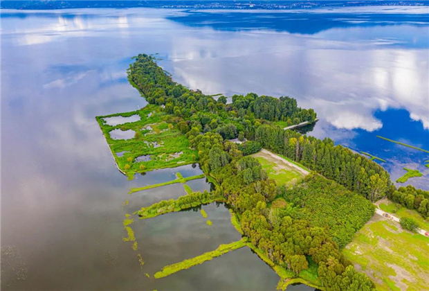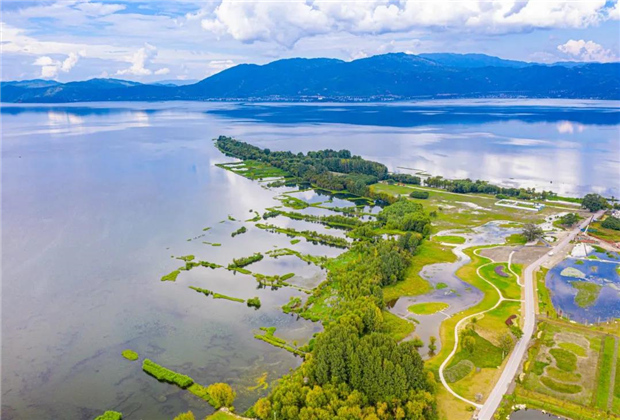 從喜洲出發(fā),穿過蜿蜒的村道,10分鐘車程就可以到達洱海邊,在這里有個因形似舌頭而得名的濕地公園。