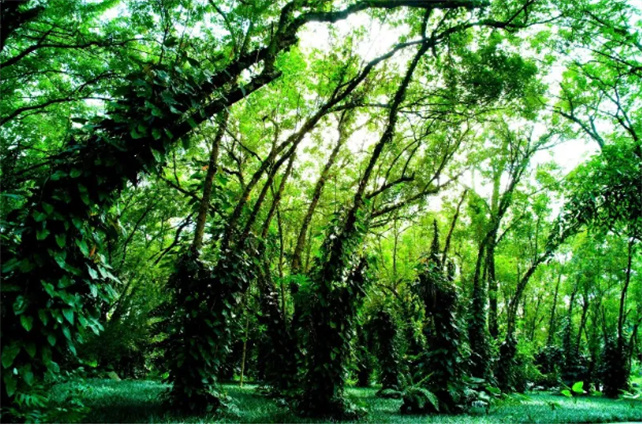 含黛遠山,漣漪近水,綠樹、藤條、苔、蕨等植物,以自己的盎然春意為西雙版納譜寫特有的“只此青綠”。