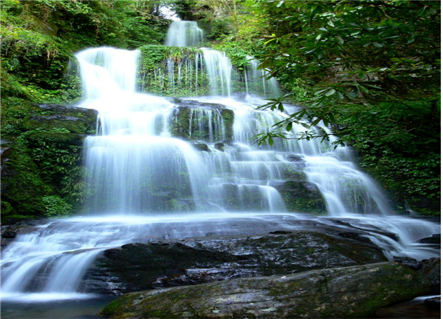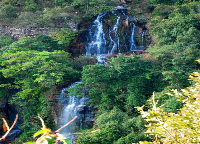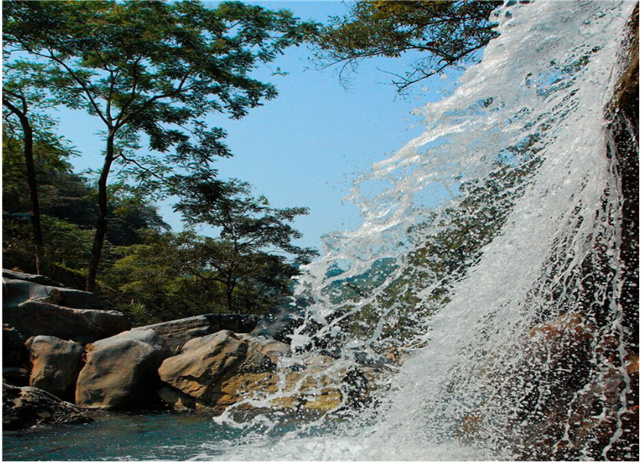 九層瀑布水聲淙淙,奔涌湍急,既似陣陣龍吟,又像低吟淺語,姿態(tài)萬千,鐘靈毓秀。乍一看柔美靈動,再看則風(fēng)情萬種。山與水互相傾情烘托,一切顯得是那么的自然,配合得如此完美和諧,相輔相成。