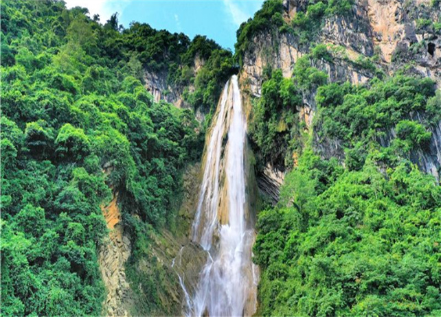 金平滮水巖瀑布被喻為一簾垂掛在藍(lán)天上的“白色哈達(dá)”。雖不及“飛流直下三千尺,疑是銀河落九天”的夸張,但它的壯美,令人心馳神往!滮水巖瀑布自上而下全長256米,傾角75度,上簾寬3米,下簾寬35米,豐水期下簾寬可達(dá)40多米。