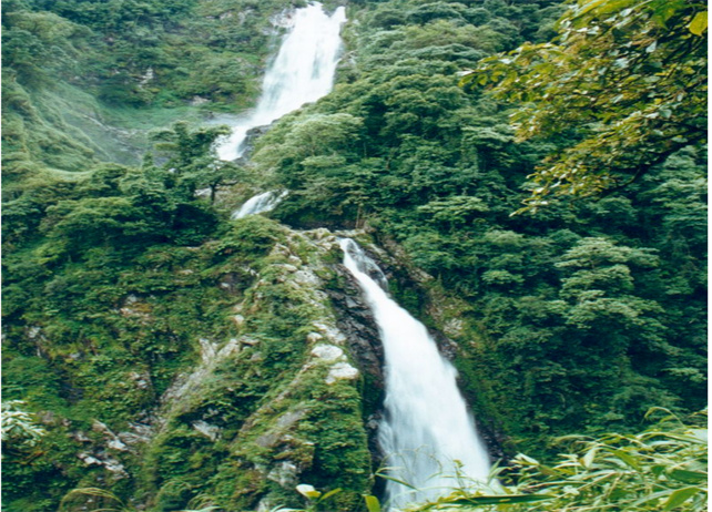 滴水層瀑布從兩山夾縫中的密林里以排山倒海之勢飛瀉而下,墜入天生似盆的滌潭中。潭里濺起的水花像一朵朵水晶做的白梅,高高拋起又紛紛飄落,整個谷底煙霧騰騰。走近瀑布,那嘩嘩的流水聲從谷底傳來,排山倒海,似萬馬嘶鳴。