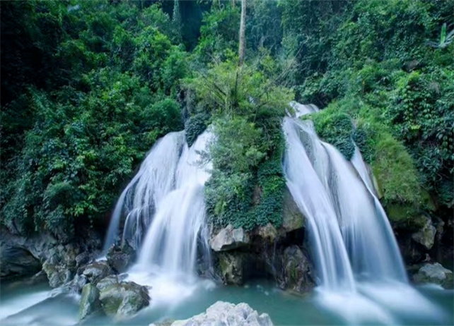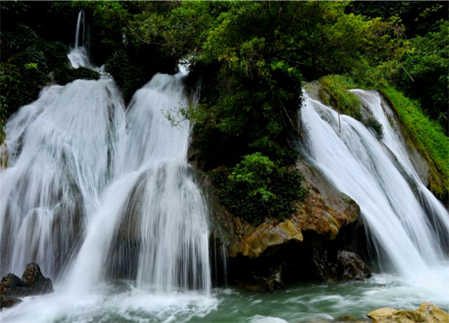 石屏縣昌明九臺瀑布位于龍武鎮(zhèn)昌明村東南方向,深藏在茂密的原始叢林峽谷之中,瀑布最高落差達(dá)到40余米,形成各具特色的瀑布群,由于瀑布發(fā)源地與大橋河落差數(shù)百米,河道狹長所以水流終年不息。