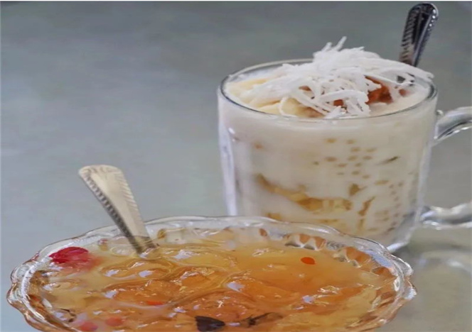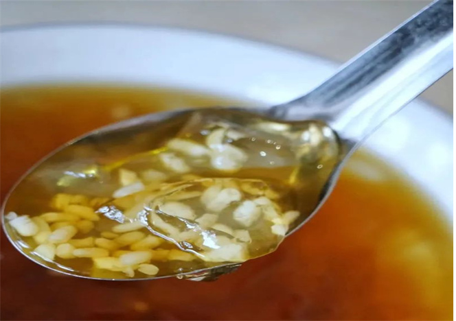 冰稀飯以白糯米為主料,配以小紅棗、西米、芝麻、紅綠絲、紅糖稀、冰渣,突出糯米稀飯的香糯,色澤潔白,點(diǎn)綴色澤鮮艷的果品,紅糖稀的純甜,冰渣的涼爽,一碗下肚,舒服至極。