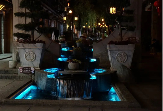 街心的水景被打上藍(lán)盈盈的燈光,仿佛月色之下的小河淌水,淙淙而下,清冷而孤寂,和街上駐場歌手們此起彼伏的搖滾樂聲形成強(qiáng)烈的對比。但若你仔細(xì)去看,終究還是能發(fā)現(xiàn)街邊游離在歌曲之外的孑然孤影,在歌聲編織的大夢中不愿清醒……