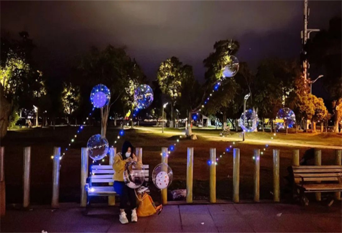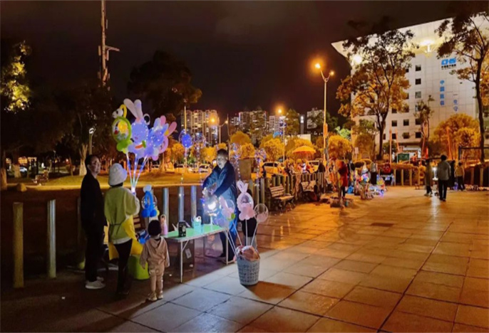 廣場一邊燈光搖曳,自發(fā)形成的夜市在此繁榮,風(fēng)箏、泡泡棒和兒童體驗項目占據(jù)了大半江山,炸洋芋、卷粉、蛋糕等美食攤位同樣繁多,還有現(xiàn)在已難得一見的糖畫。值得一提的是,棉花糖和發(fā)光氣球的攤位前,情侶的數(shù)量好像比孩子還多……