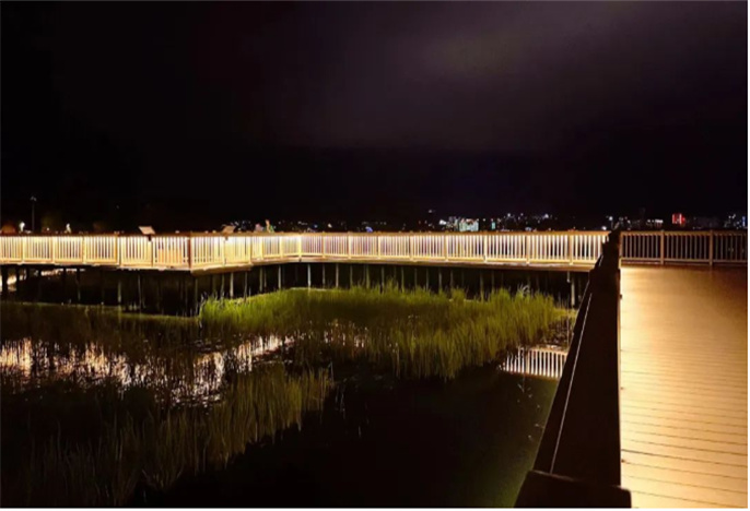 健身中心的廣場緊連著洱海濕地公園,若是白天來,就能看到在蘆葦蕩中穿梭飛舞的鳥兒,晚上則只剩下木頭棧道上昏黃的裝飾燈成為唯一的光源,四周黑暗而寂靜,偶爾傳來幾聲難辨物種卻格外清晰的鳴叫,告知這里的夜晚并不寂寞。