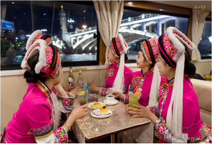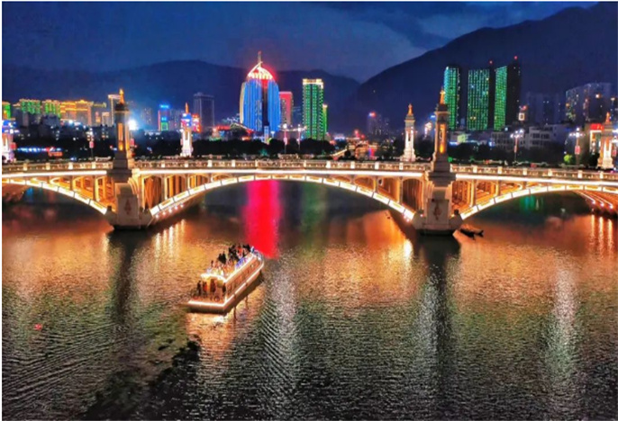一路總覽大理市的夜色與繁華。航線還經(jīng)過大理的網(wǎng)紅橋“興盛大橋”,在各色霓虹燈映襯下,游船穿過這座英倫風(fēng)十足的大橋,仿佛穿越時空行駛在泰晤士河之上,別有一番意趣。